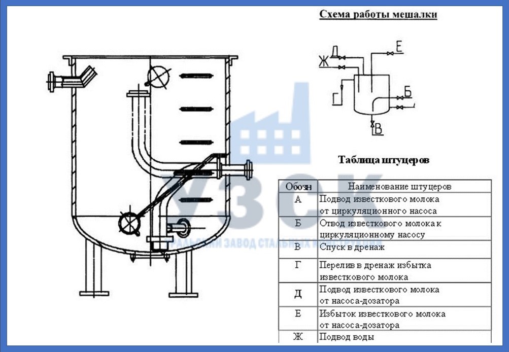 Цилиндрический бак с конусным днищем, переходящим в дренаж, выполняет растворение суспензии, используя для перемешивания поток воды, нагнетаемой насосом. Рабочий раствор отбирается, а оставшийся шлам удаляется через дренаж.